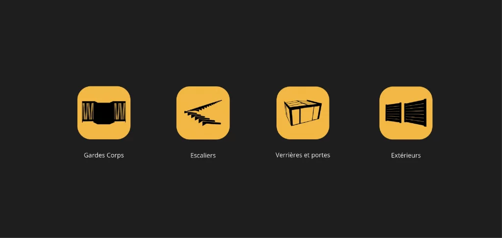 Pour AMF, on a conçu une ambiance de marque hyper moderne autour du contraste entre un noir adouci et ce jaune mat que l’on retrouvera sur tous les supports de l’entreprise. On a aussi réalisé un ensemble d’iconographie représentant les corps de métier et les prestations en métallerie serrurerie.
