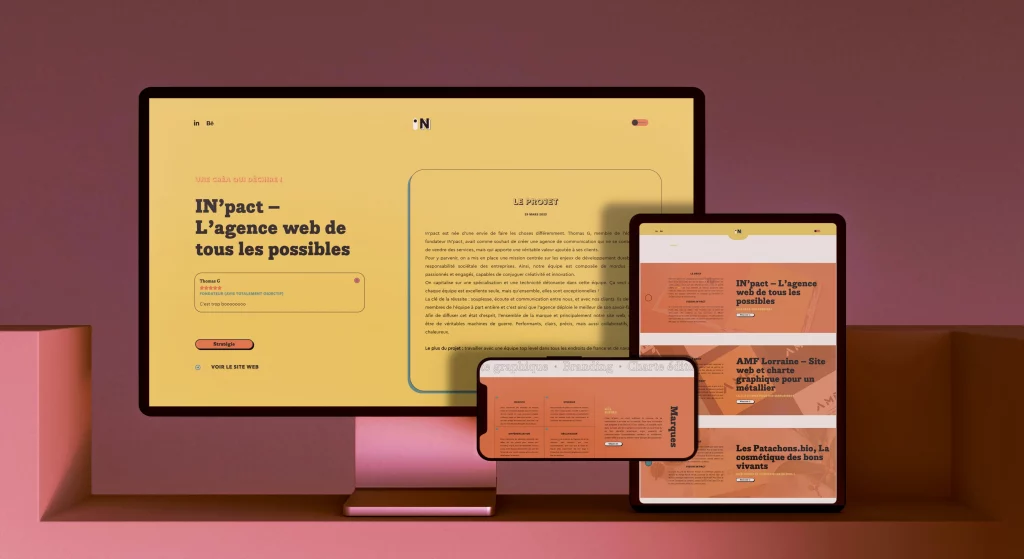 A la recherche de sens à travers IN’pact, on a soigneusement sélectionné notre palette de couleur et nos typos afin de choper un look old school, un peu rétro et hyper reconnaissable. On a préféré un ton léger, très calqué sur le discours réel de l’équipe, qui tutoie souvent et dis parfois on. On aime la proximité avec nos clients, la sincérité de nos échanges, et on voulait que ça se voit !